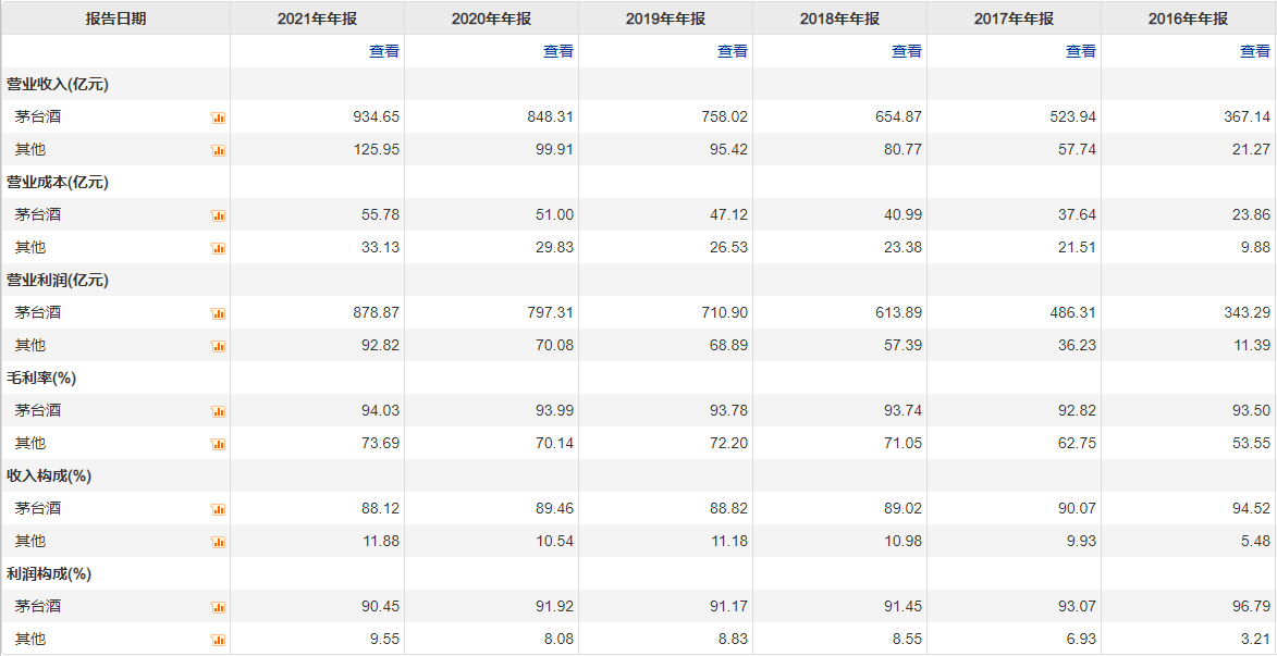 如上图所示,茅台酒历年收入占比都在90%左右波动,利润上更是每年都贡献了90%以上的利润。