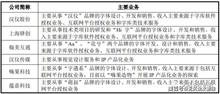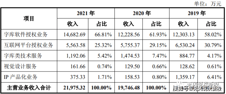 (二)主营业务及服务具体概况 1、字库软件授权业务 字库软件授权业务是指公司将字库版权授权给商业用户,允许用户根据授权 协议约定,在许可使用期限及范围内使用一款或多款字库,公司收取相应的授权 许可费。根据授权范围及客户需求的不同,字库可被企业应用于全媒体发布、媒 体出版、嵌入式业务等不同使用场景。截至 2021 年 12 月 31 日,公司已经推出 具有著作权的 B 端字体 700 余款,并开发形成 1,700 余套字库(含字由业务字体)。2、互联网平台授权业务 (1)交互类平台授权业务 交互类平台授权业务主要指公司与腾讯公司合作,在手机 QQ、QQ 空间等 腾讯移动平台提供互娱式字体,供终端用户于腾讯移动平台使用。用户在腾讯移 动类平台上使用互娱式字体时,不仅自己可以看到具有特殊效果的字体,其他用 户无需单独下载安装,即可在与该用户聊天、访问其 QQ 空间时,即时看到其使 用的具有特殊效果的字体。该业务有效解决了在移动社交应用场景中,字体千人 一面的问题,满足了用户的个性化聊天社交需求。3、字库类技术服务 一款精准传达品牌理念的专属字体不仅可以强化品牌的独特性并给用户留 下深刻印象,还可以通过优化产品功能,丰富产品体验,进一步塑造品牌形象、 提升品牌价值。公司提供为客户定制化打造凸显品牌形象专属字体的服务,涵盖 定制设计中文或拉丁文整套字库,以及中文与拉丁文的互相匹配在内的字库类技 术服务。4、视觉设计服务 公司致力于为商业品牌与影视文化综艺行业提供具备字体文化独特性的设 计解决方案。公司拥有高水平的设计师团队,可为客户提供高品质的视觉设计服 务。公司在 20 多年的字体产品开发过程中,形成了较强的文化解读提炼并将其 产品化的能力,依托公司丰富的字库产品和强大的文化资源产品化能力,在提供 设计解决方案时可根据客户需求,以 IP 文化赋能的形式,积极融入公司的产品 和设计,为有文化定位需求的客户服务。5、IP 产品化业务 IP 产品化业务指公司利用自身的设计能力和 IP 运营能力将无形的影视/动漫 IP 资源设计成 IP 衍生品,并进行 IP 衍生品销售的业务,主要包含 IP 衍生品套 装销售和 IP 衍生品单件销售两种模式。6、公司及子公司所从事的业务 截至本招股意向书签署日,公司共 5 家子公司。公司及各子公司的主要业务 情况如下: