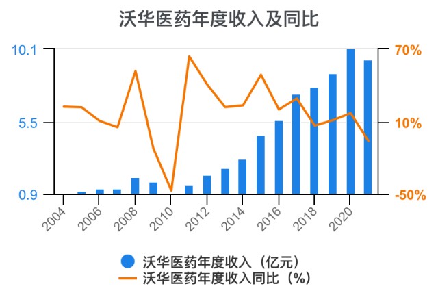 沃华医药年度收入,2021期数据为9.43亿元。 沃华医药年度收入同比,2021期数据为-6.3%。