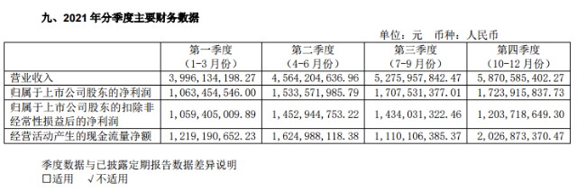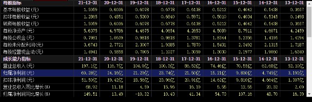中国巨石,3月19日披露2021年年报,2021年,公司共实现营业收入197.07亿元,同比增长68.92%;实现归属于母公司所有者的净利润60.28亿元,同比增长149.51%。每股收益1.51元。