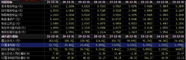中材科技,中材科技于2022年3月18日披露年报,公司2021年实现营业总收入203亿,同比增长7.6%;实现归母净利润33.7亿,同比增长65.4%,增幅连续5年保持在20%以上;每股收益为2.01元。