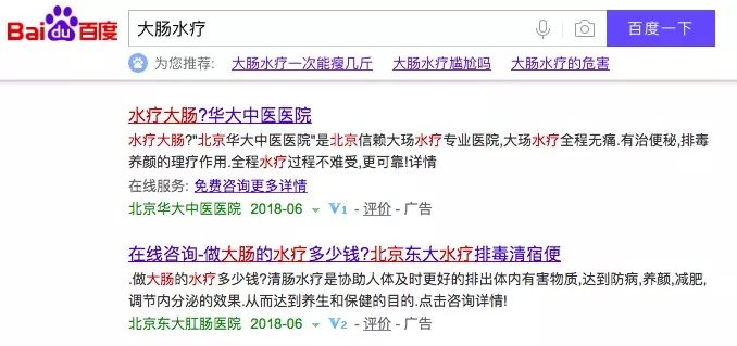 百度搜索关键词「灌肠排毒」和「大肠水疗」,发现还有不少医院做起了广告,看来「灌肠排毒」很有市场。