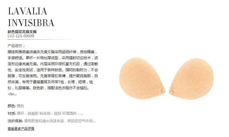 娜娃莉雅燕美诗美体无痕文胸采用超细纤维,质地精美,手感舒适。罩杯一片特加厚成型,采用镭射切边技术,波浪形边缘完美无痕。内层采用环保机菌无机胶,通过率敏性、安全性测试,适用于各种肤质。强轫的黏附力,不会脱落,可反复使用。无肩带背扣束缚,提升聚拢胸部,自然丰满,专用于露肩露背及吊带T恤,长裙,短裙,恤衫,礼服等等。肤色款,搭配浅色衣服亦不会尴尬。