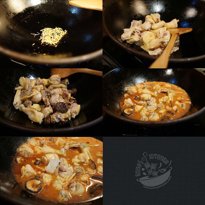 3.倒入一半的红麴米酒和冰糖,加盖中小火焖煮15-20分钟至鸡肉变软。