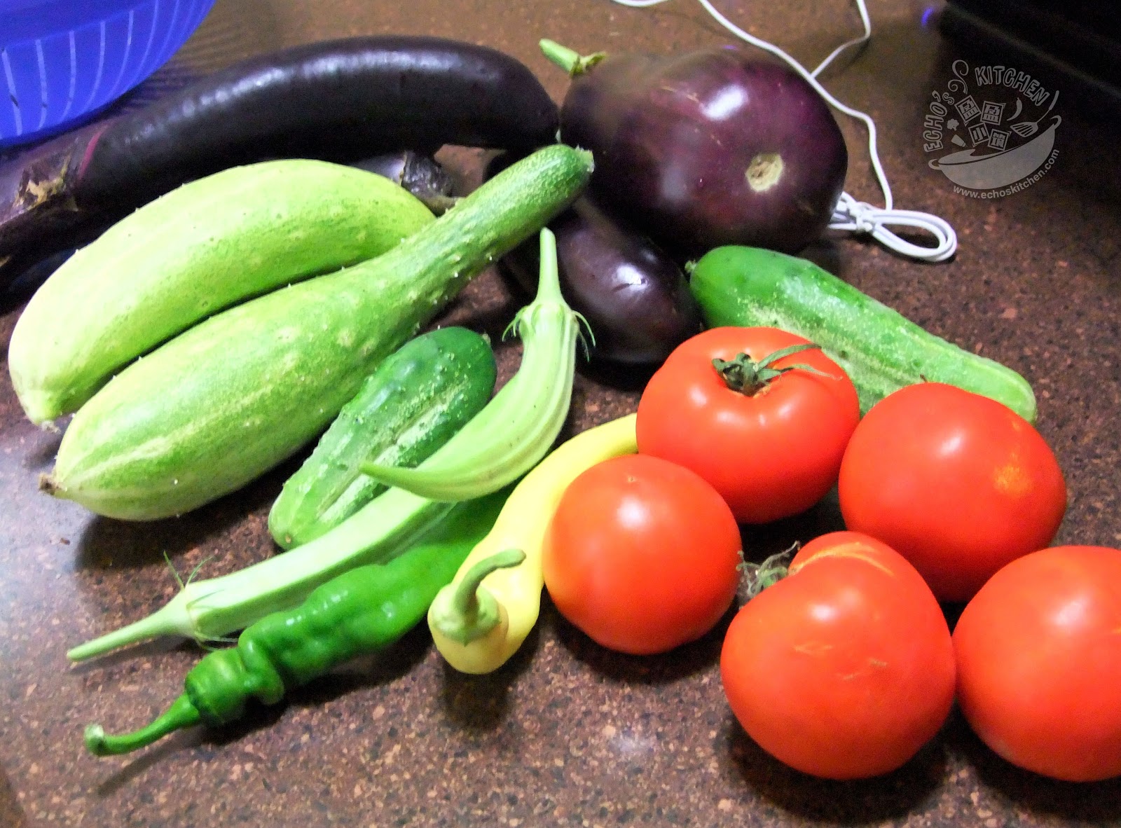 I finally got to harvest my Aubergine/Eggplant today, together with tomato and chili harvested yesterday. it will be a pity if I do not make this delicious mashed eggplant dish!