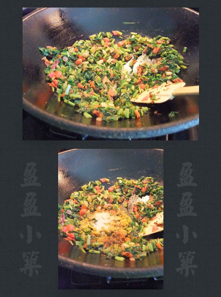 加入切好的萝卜叶子,炒8分钟左右,然后加入番茄丁,再继续煸炒2-3分钟,加入芫荽粉,辣椒粉,黄姜粉,炒3-5分钟,加盐调味即可。