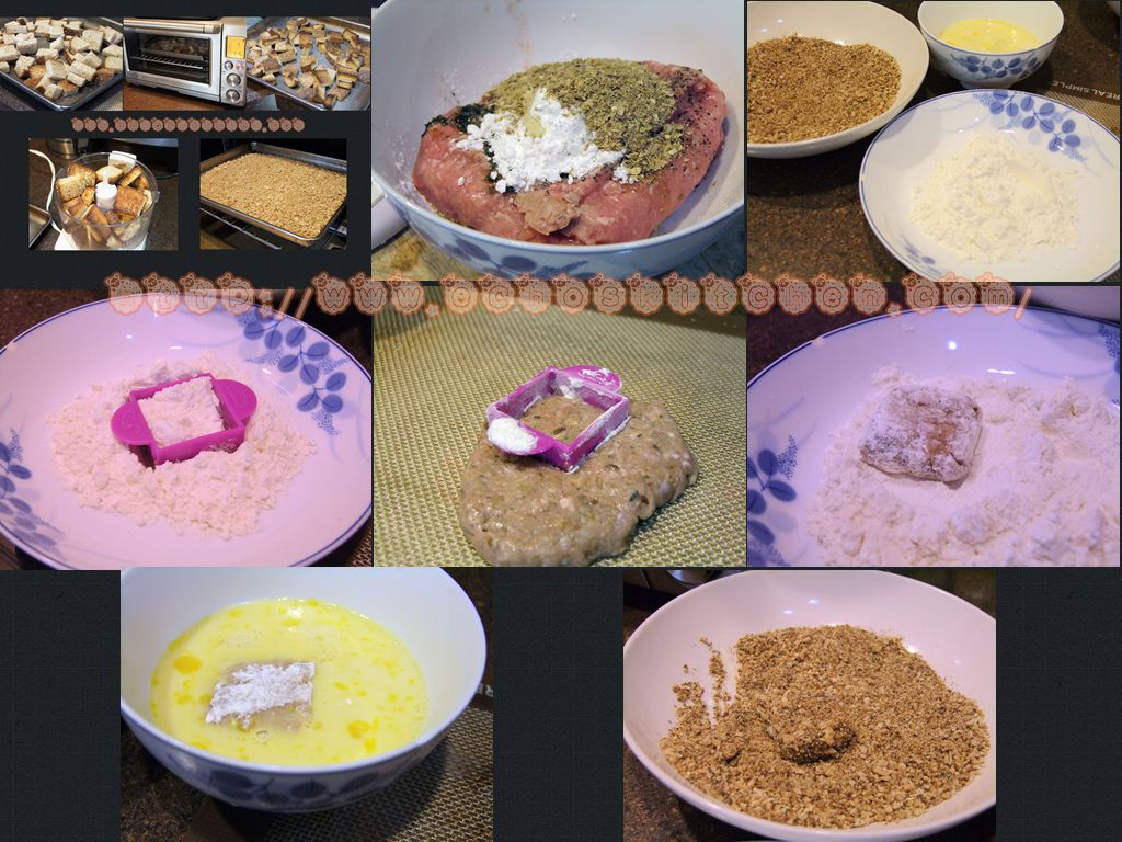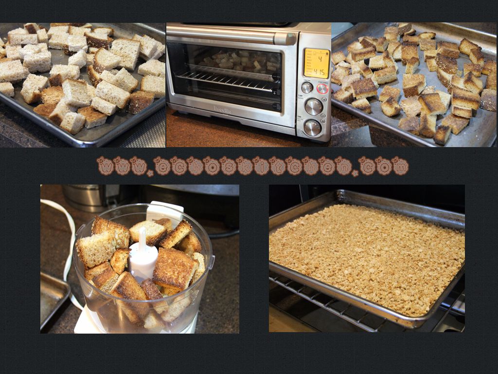 我用了自己制作的面包糠,家里的面包是有机杂粮的,所以颜色比较深。把面包切小块入烤箱烤4-5分钟至变脆。冷却后用食物料理机把面包切碎,加入1