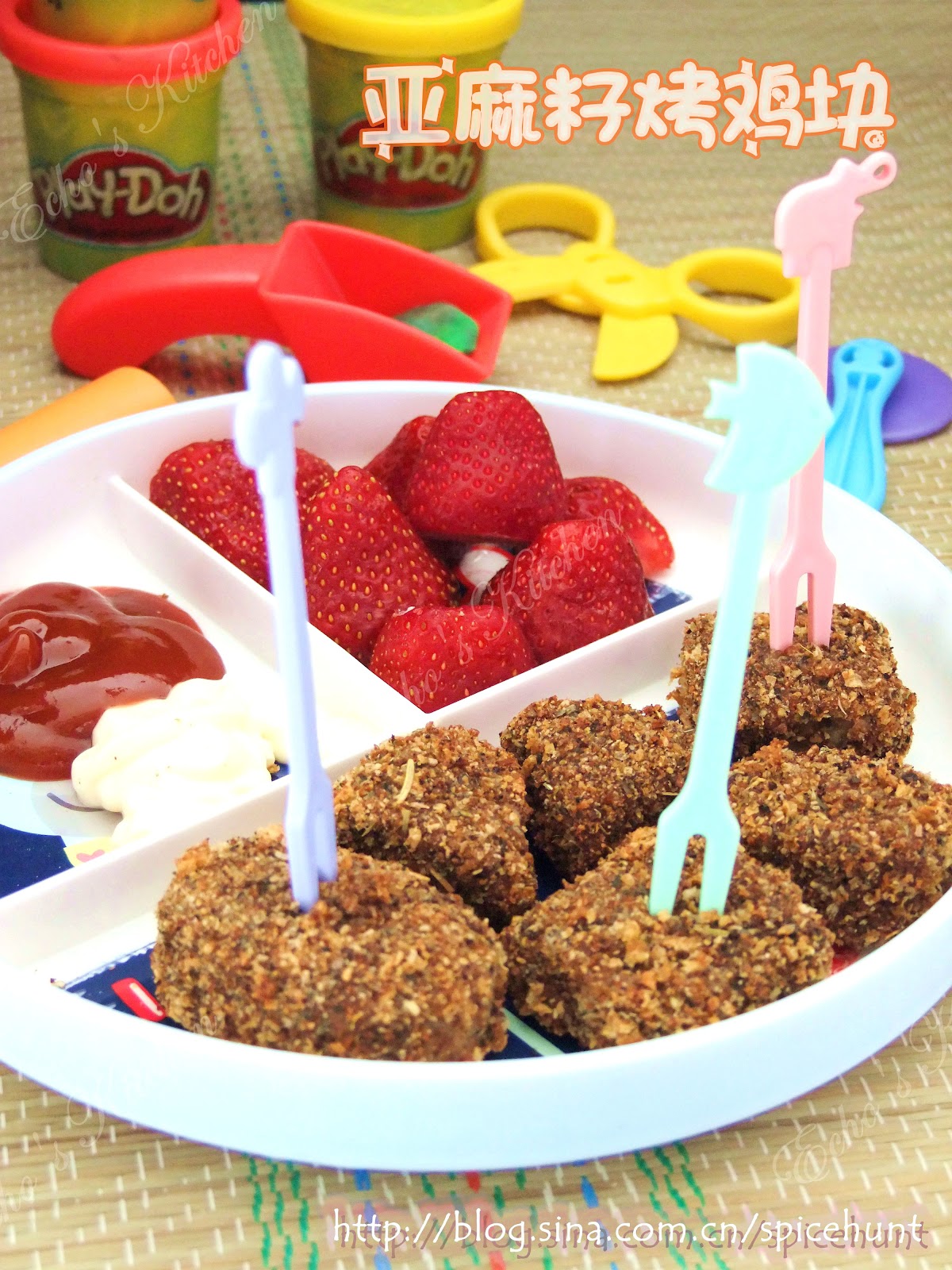 今天用他喜欢的形状模型做他喜欢的烤鸡块,妈妈悄悄地给加了亚麻籽和燕麦粉,他也没吃出差别,一口气吃了好几块哦!