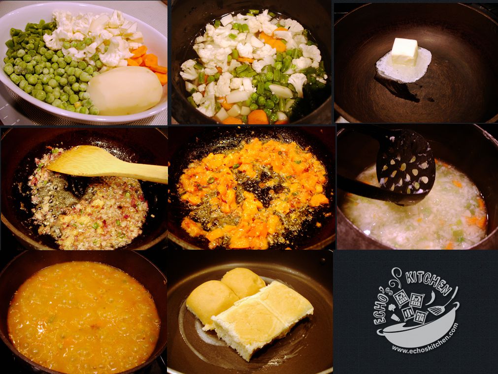 1. 把蔬菜洗干净切块,加一点盐和刚刚没过蔬菜的水高压8-10分钟,然后用用压土豆泥的smasher 把蔬菜稍微压碎.