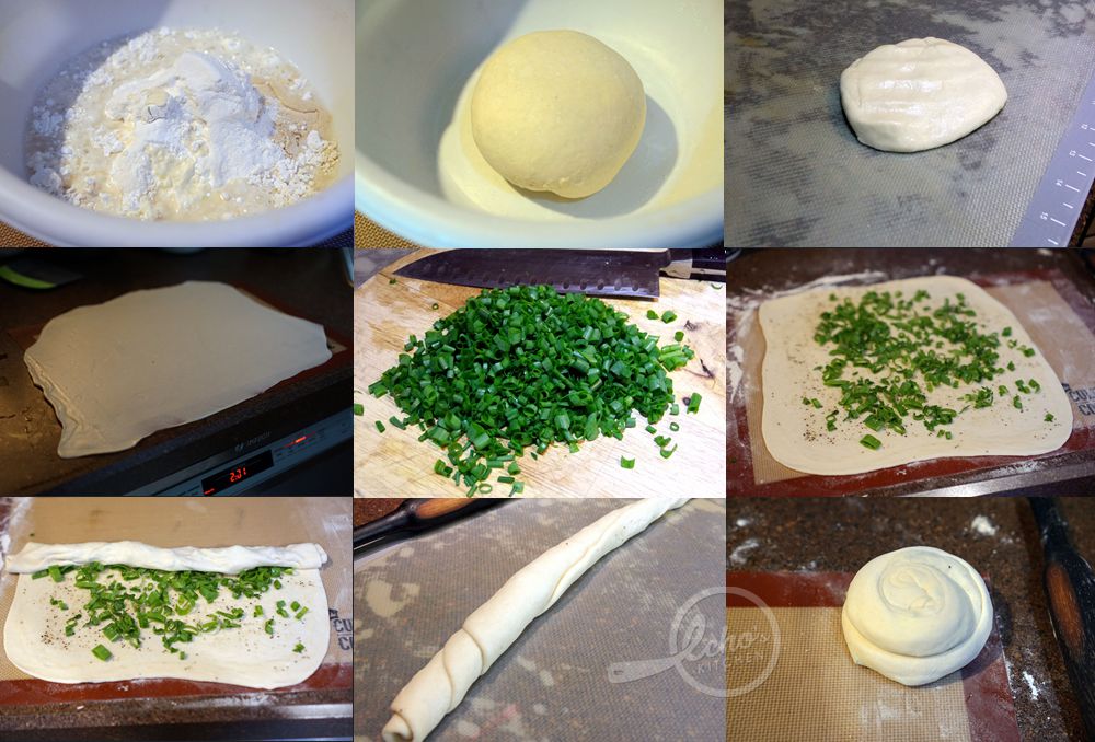 4. 然后由上至下,慢慢地卷起,稍微类似拧毛巾/麻花那样的拧一拧已经成圆筒状的面卷(这个做法是把空气挤压出来,待会儿擀的时候葱花才不会漏得太厉害)。把卷起来的面饼再卷成螺旋状(如图),尾端塞到底部,压实放一边松弛。