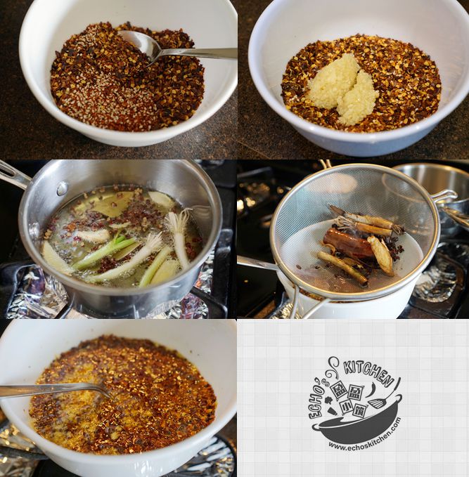 1. Place Chili flakes, Chili Powder, Sesame Seeds and minced garlic in a stainless steel or ceramic bowl.
