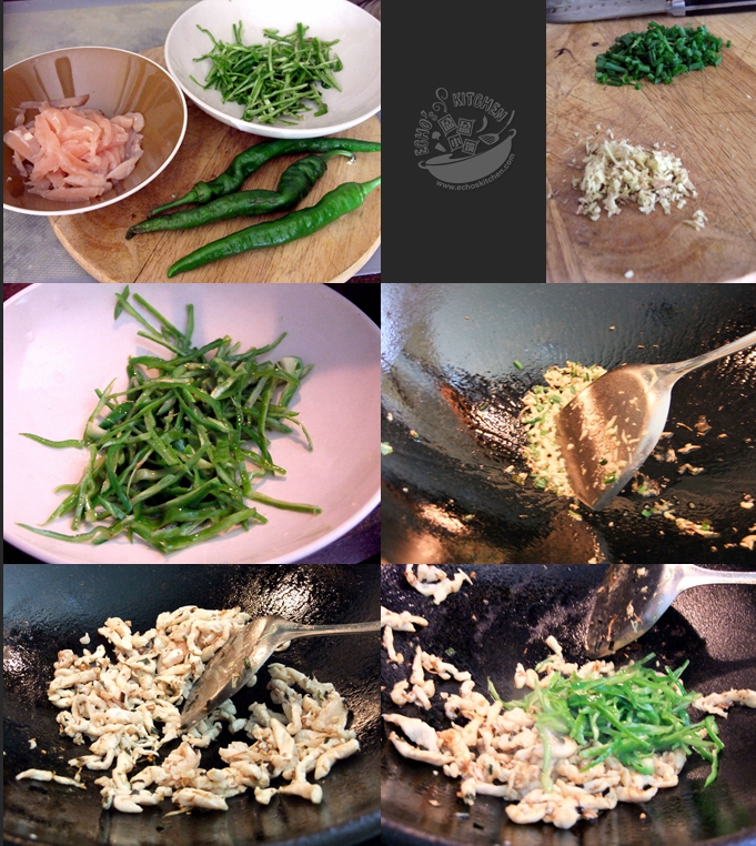 1. Sliced and shred chili and chicken, marinate the chicken for 10-20 minutes.2. In a cooking pan/wok, add 2 tbsp of vegetable oil, heat it up and give the shredded chili a super fast stir,