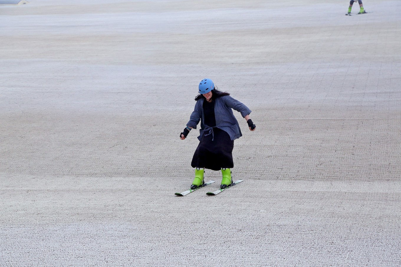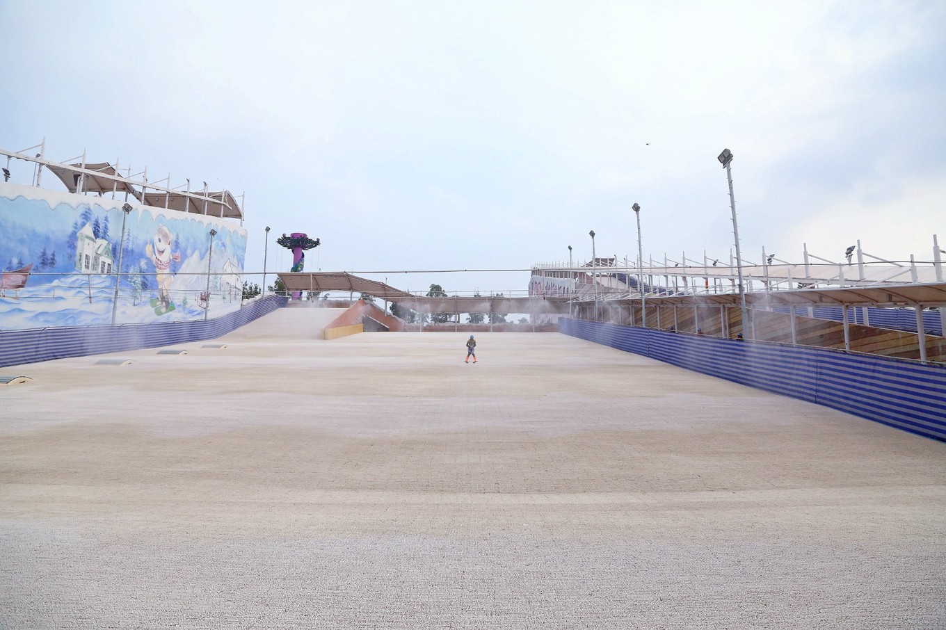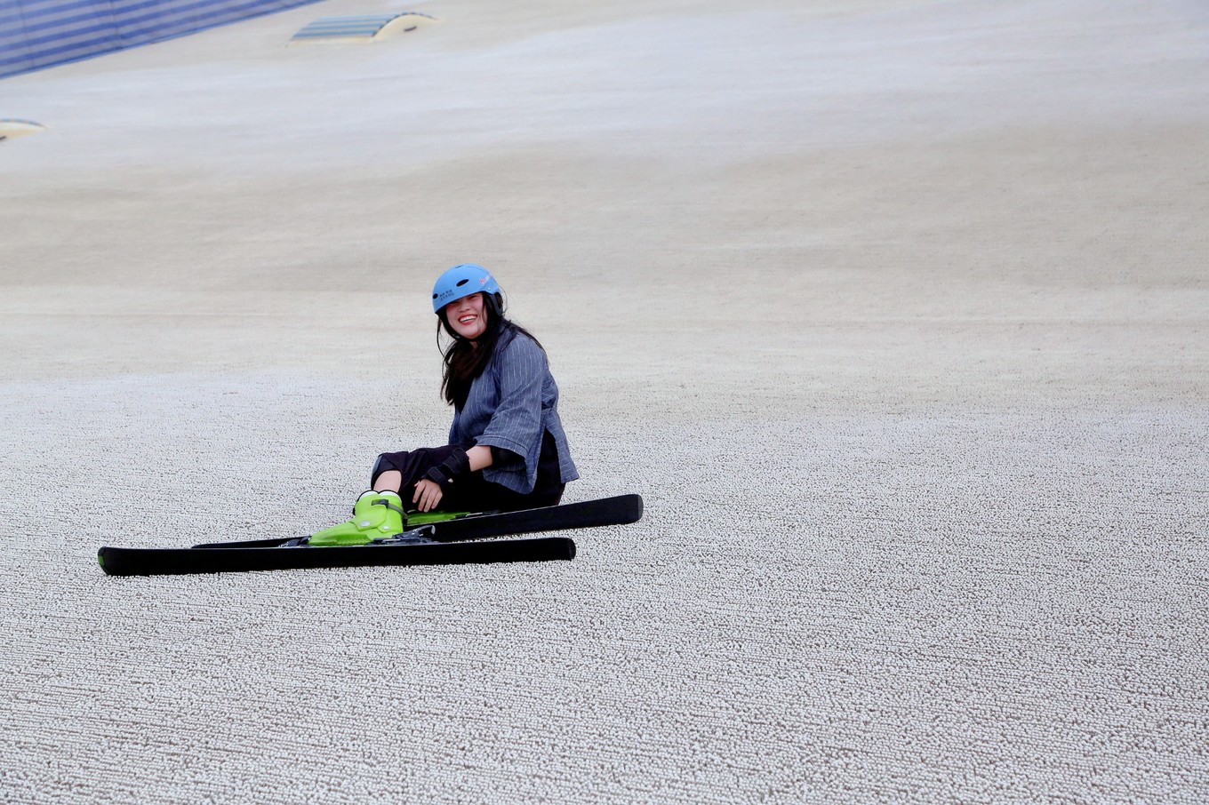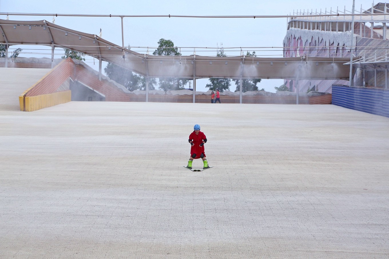 滑行一两次,掌握要领后,便不再那么紧张,可从容淡定的向下滑行。滑行的途中,喷淋头的雾水洒在脸上,恍惚间有种在真正雪道上滑行的感觉,清爽刺激。