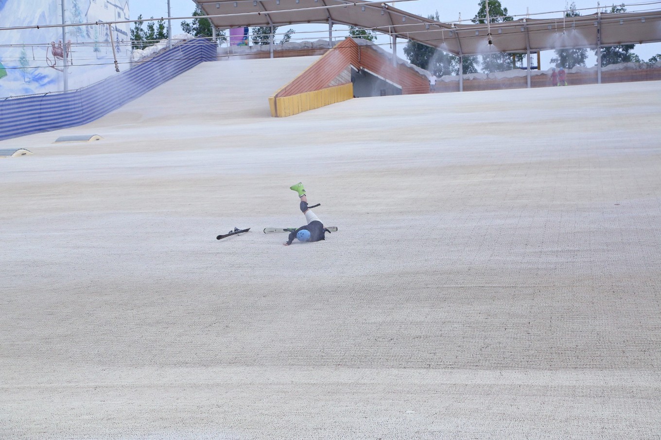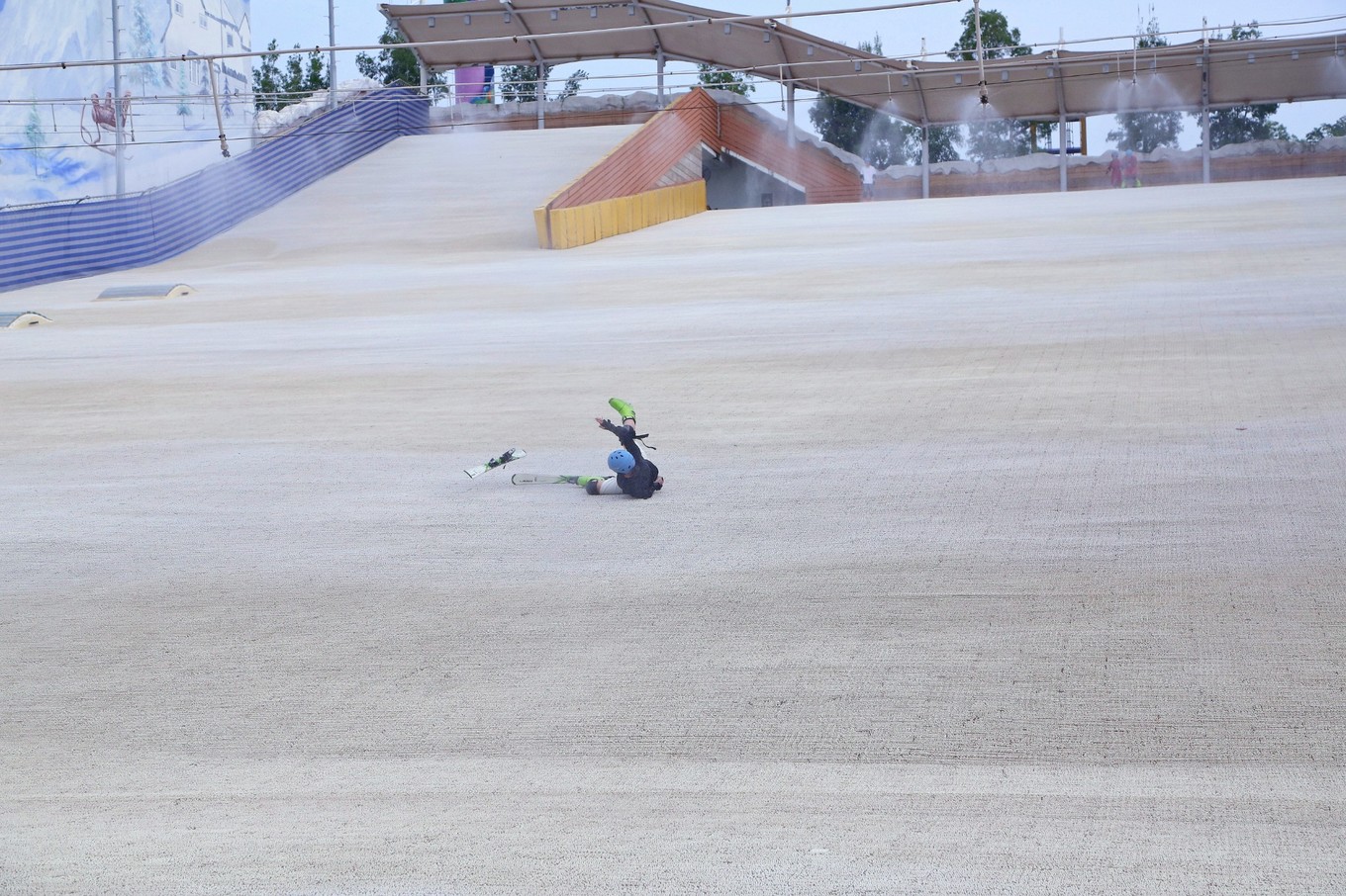 当慢慢往下滑的时候,摔几次那太正常了。不摔不成长,从哪跌倒就从哪儿爬起来。看着小伙伴们一个个摔到后爬起来接着滑,这种不放弃的精神,不难看出他们对旱雪热爱。