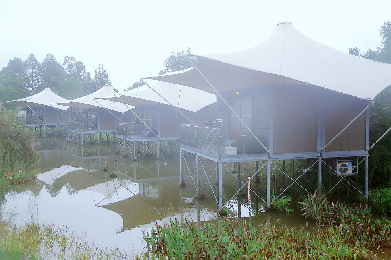 醒在雨雾中,走出房门。看着雨雾中的水上风情屋,别有一番韵味。