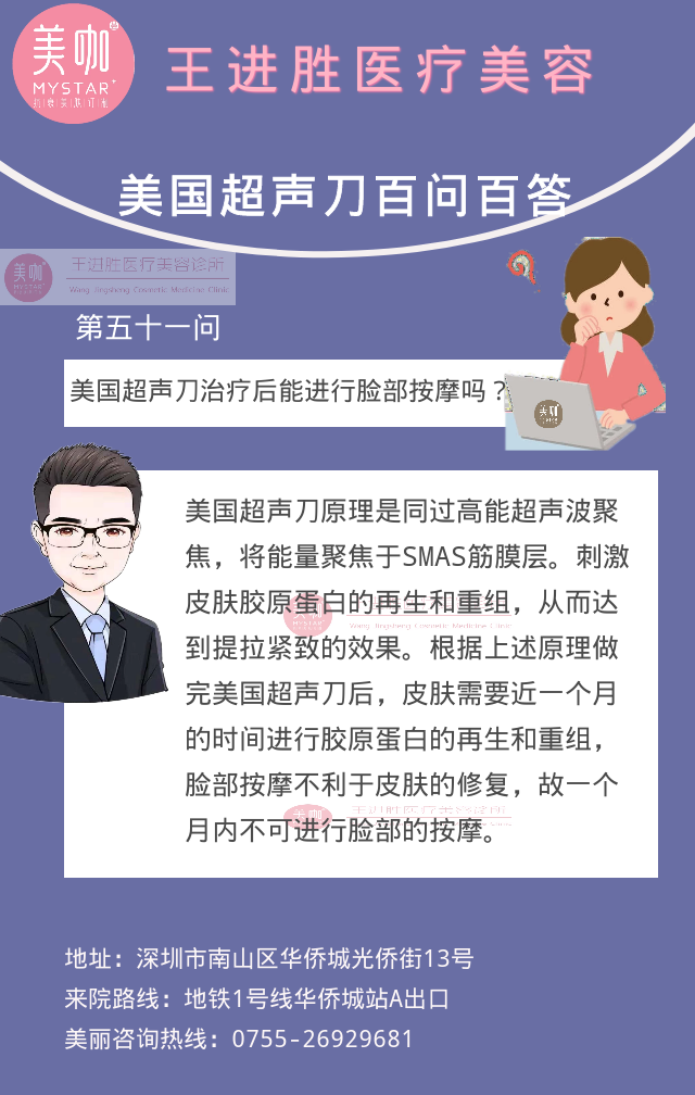 美国超声刀原理是同过高能超声波聚焦,将能量聚焦于SMAS筋膜层。刺激皮肤胶原蛋白的再生和重组,从而达到提拉紧致的效果。根据上述原理做完美国超声刀后,皮肤需要近一个月的时间进行胶原蛋白的再生和重组,脸部按摩不利于皮肤的修复,故一个月内不可进行脸部的按摩。