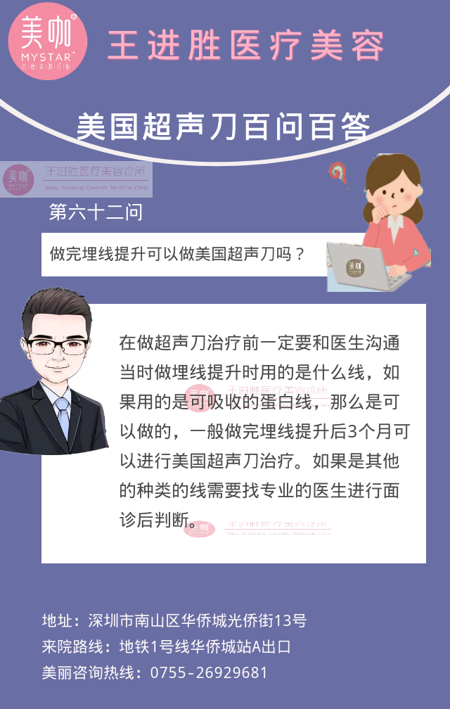 在做超声刀治疗前一定要和医生沟通当时做埋线提升时用的是什么线,如果用的是可吸收的蛋白线,那么是可以做的,一般做完埋线提升后3个月可以进行美国超声刀治疗。如果是其他的种类的线需要找专业的医生进行面诊后判断。