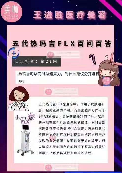 五代热玛吉FLX在治疗中,作用于皮肤组织层,起到紧致的作用。而美国超声刀作用于SMAS筋膜层,更多的是提升的作用。效果的体现在三个月后逐渐达到最佳,同时局部问题改善不佳的情况也会显现,再进行五代热玛吉治疗时可以针对现有的问题进行治疗发数的有效分配,从而达到更好的效果。所以建议如果时间允许的情况下超声刀后最好间隔三个月后再进行热玛吉的治疗。