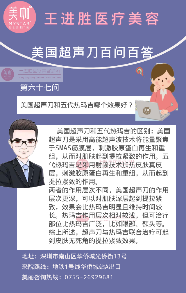 美国超声刀和五代热玛吉的区别:美国超声刀是采用高能超声波技术将能量聚焦于SMAS筋膜层,刺激胶原蛋白再生和重组,从而对肌肤起到提拉紧致的作用。五代热玛吉是采用射频技术加热皮肤真皮层,刺激胶原蛋白再生和重组,从而起到提拉紧致的作用。
