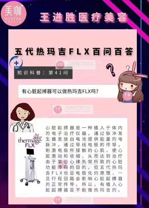 心脏起搏器是一种植入于体内的电子治疗仪器,通过脉冲发生器发放由电池提供能量的电脉冲,通过导线电极的传导,刺激电极所接触的心肌,使心脏激动和收缩,从而达到治疗由于某些心律失常所致的心脏功能障碍的目的。但五代热玛吉FLX也是电极化的原理,一旦行程回路会影响心脏起搏器的正常传导。所以,有心脏起搏器是不能做热玛吉的。