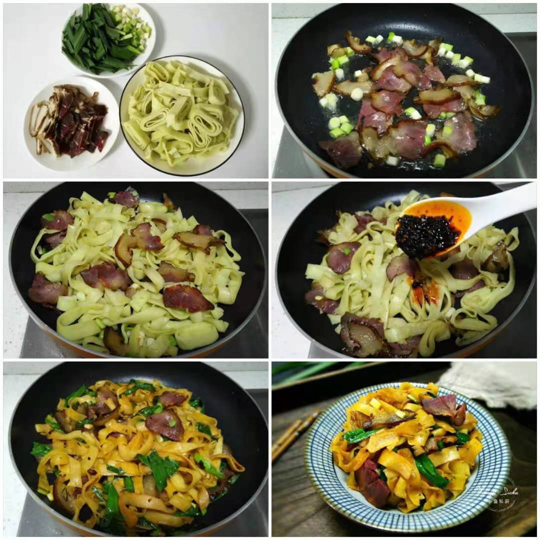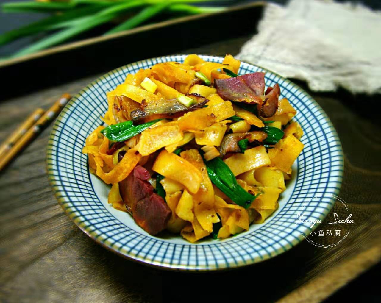 食材:腊肉1小块 豆丝1张 青蒜3棵 老干妈1勺