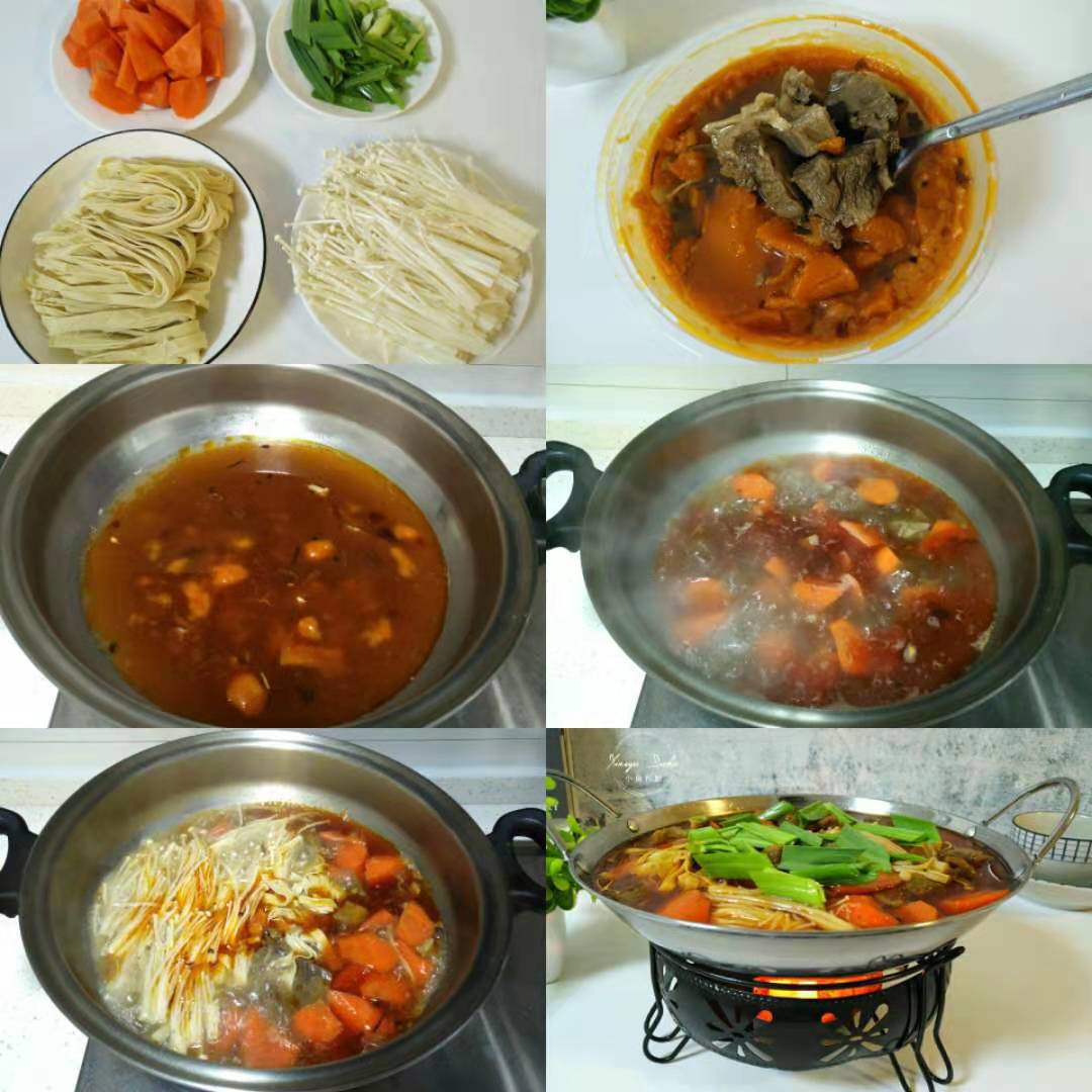 4,加入胡萝卜,煮至断生,加入豆腐皮,金针菇煮5分钟,撒上大葱。端上桌,小火咕嘟咕嘟,热乎乎的,有肉有菜,下酒又下饭。