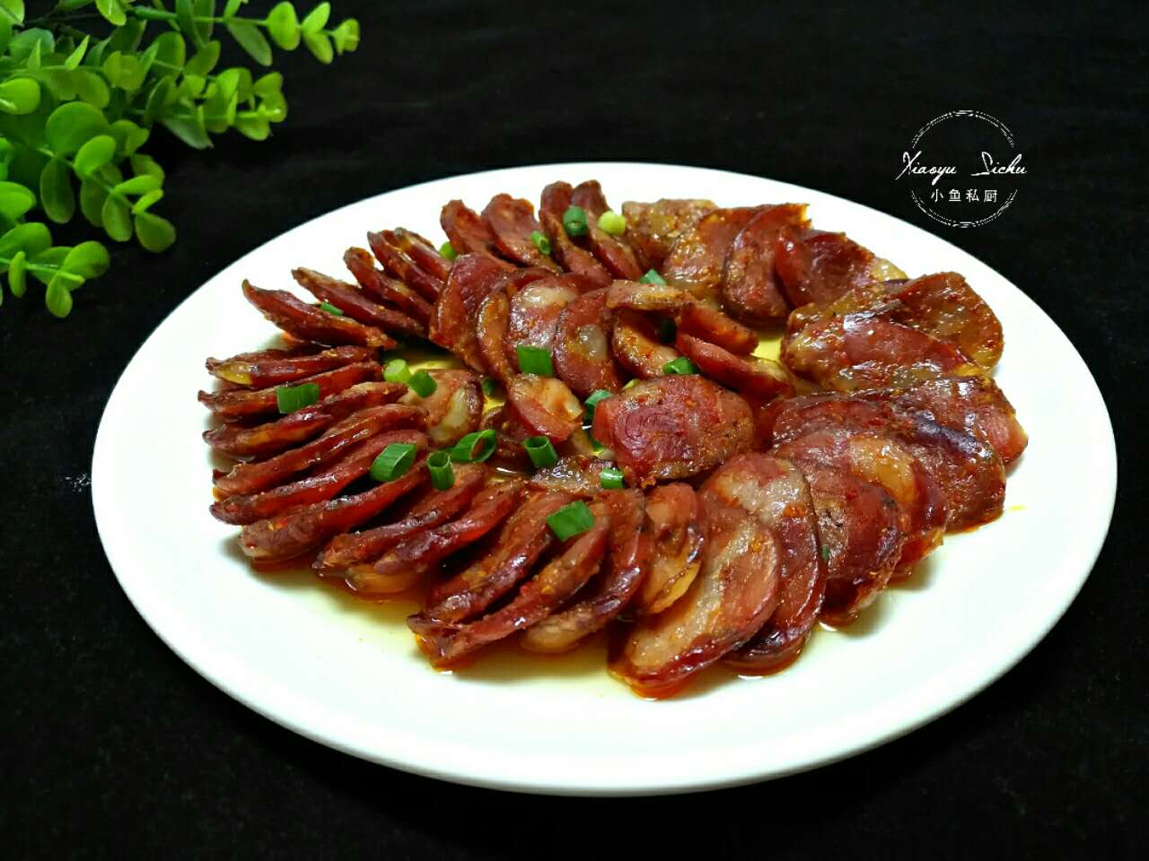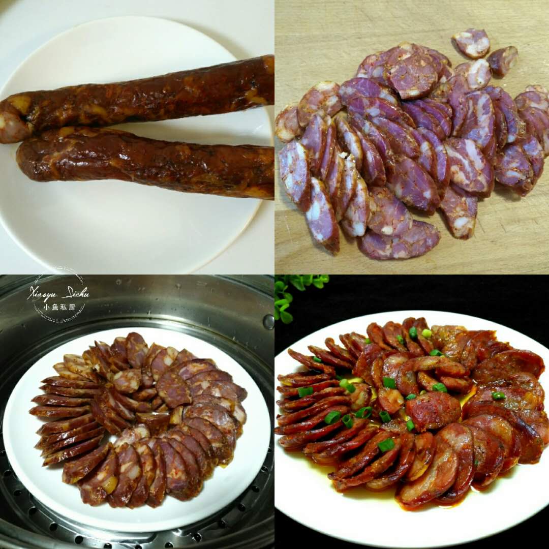 3,冷水上锅,蒸30分钟,把腊肠蒸熟,撒上葱花点缀一下,一道美味的蒸腊肠就做好了,麻辣鲜香,下酒又下饭。