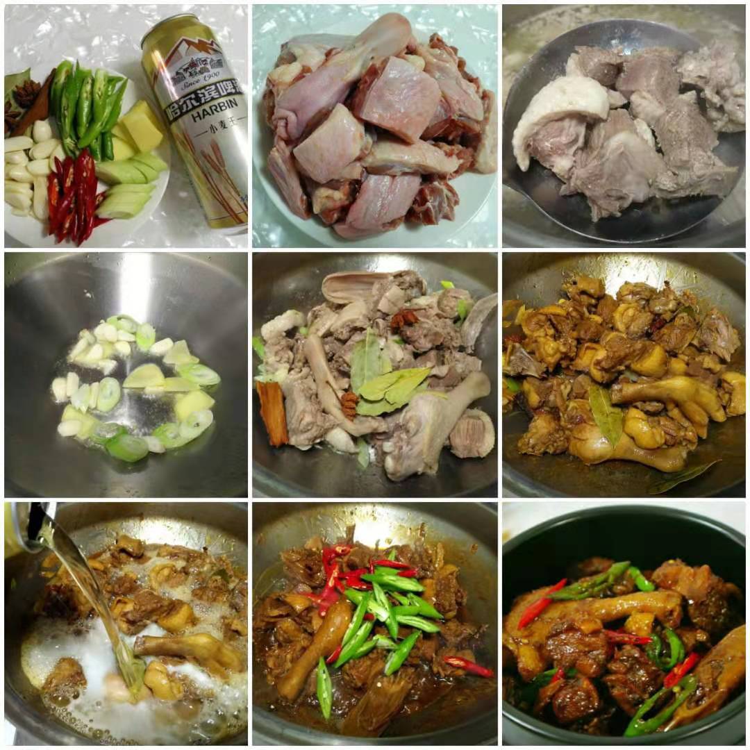 食材:鸭子半只 啤酒500毫升 小米椒5个 杭椒3个 姜 蒜 大葱 八角 香叶 桂皮(适量)