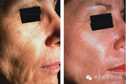 55岁女性光老化皮肤,面部有粗深的周围和弹性纤维的皮肤纹理(左图)用70%的乙醇酸每月做一次化学剥脱,每日每天使用2次10%的乙醇酸霜9个月效果对比图(右)
