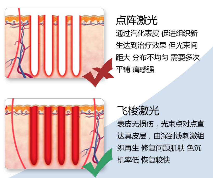 注:单次的治疗效果不及剥脱点阵激光,所以一般都建议做疗程治疗效果明显。痛感低(相对于点阵激光)。