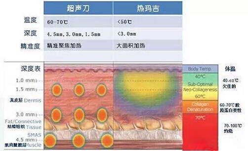 两者的区别是,超声刀是一个聚焦性的能量在SMAS筋膜层释放,就像我们小时候用放大镜在太阳光底下聚焦,就可以燃烧起来。热玛吉是用电流均匀流动的原理,电流流到电阻的时候会产生热,热回到真皮层,胶原蛋白会均匀的增生。