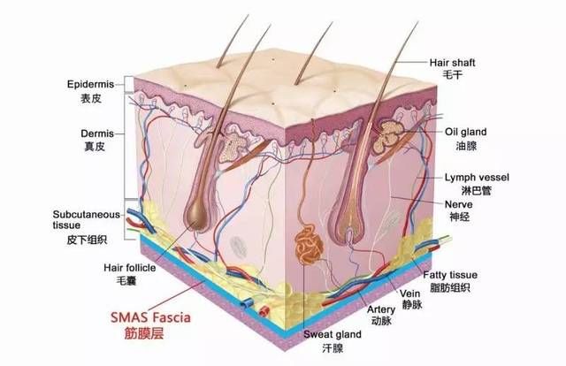 我们日常的护肤品只是作用于皮肤表层,而位于我们皮肤下4.5mm深处,有一称作SMAS筋膜层的组织层。这层组织层相当于皮肤下面的钢筋网架,支撑皮肤避免松弛下垂。