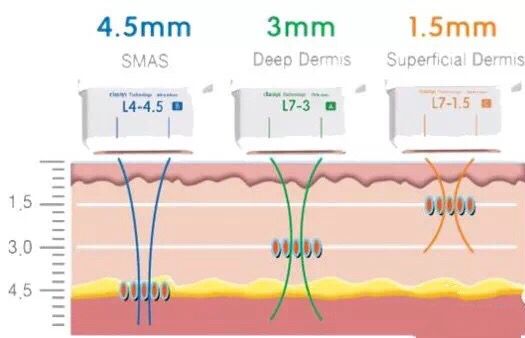 超声刀源自时下最新美容高科技——美国ulthera技术,配有三个针对不同层次的治疗头(如上图),利用聚焦式超声波技术,以非侵入式治疗到皮肤的SMAS(筋膜层),让皮下细胞通过细胞膜的变化重新排列,由深到浅带动皮肤紧致提拉,刺激胶原蛋白增生,促使下垂、皱纹的脸变紧实,实现表皮层、真皮层、SMAS层深层立体抗衰。