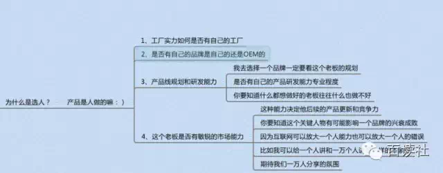 大家看这个思维导图应该能看清楚,第四点就是这个老板是否有敏锐的市场能力。这种能力决定他后续的产品更新和竞争力,你要知道这个关键人物有可能影响一个品牌的兴衰成败,因为互联网可以放大一个人能力也可以放大一个人的错误,比如我可以给一个人讲和一万个人讲是不一样的。