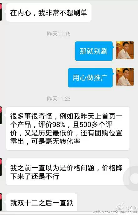 @庄帅:无刷单无交易的怪圈会让淘宝陷入进退两难的境地,卖家急需要新的平台救赎 //@胡小方:刷单是王道,刷单是工作,刷单是每天必不可少的