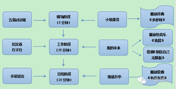 (一)我的未来 小组成立: 在“五指对对碰”的最后环节,形成二人一组。这两个人要成为本次活动的生命贵人,彼此观察、关照。 然后二变四,四变八,形成8人小组,选出组长、组名和口号。