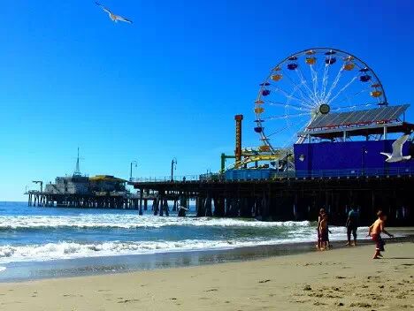 位于Santa Monica码头北部的Santa Monica海滩是洛杉矶最出名的海滩之一。它的海岸线有2英里长,在那里你可以尽情的玩耍沙滩排球或者沿着海岸线悠闲地骑自行车,享受着着海风迎面吹拂而来,徜徉在加利福尼亚热情的阳光下做个慵懒的日光浴。海岸上布满了各种大大小小的宾馆、餐厅、电影院,值得一提的是距离海滩不远处有一个适合逛街的行人徒步区-“第三漫步街 Third Street”街道两旁有许多温馨浪漫的咖啡厅、电影院和很多备受年轻人喜爱的小商店,是逛街购物的天堂。街上还有许多引导流行的精品店,以及美味的意大利餐厅,不管是平日还是周末,街上都很非常的热闹,街上还有许多乐器演奏师的表演,偶尔也会有一些著名的乐器大师来此献技。