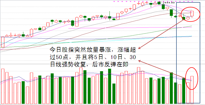 今日股指突然放量暴涨,涨幅超过50点,并且将5日、10日、30日线强势收复,说明场外资金在两会前再度入场做多,后市反弹在即!