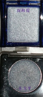这两块眼影都是蓝色,是那种很浅的蓝,里面碎碎的带有白花花的颜色。他们分别为MGPIN眼影和美宝莲单色眼影之13号神秘蓝。其实当初买美宝莲神秘蓝的时候我犹豫了很久,虽然我眼影很多,但是我坚决讨厌收藏相同颜色的眼影,看到神秘蓝的时候我马上就觉得它和毛戈平的一块眼影相似,当时在超市也没有办法对比,最后还是回家拿出来凭记忆对比了一下,感觉是这两块颜色相似但是不相同。下面给大家看一下对比图。