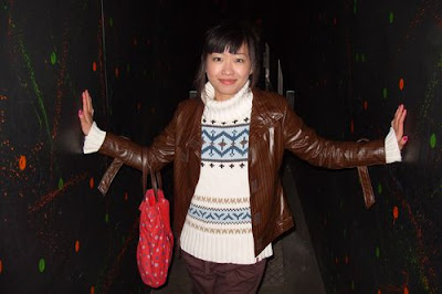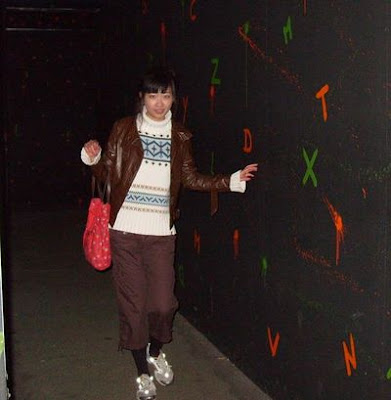 近了恐怖屋,就被两边旋转的柱子快速“吸”了进去,转了几个弯,里面一团漆黑,脚下不时碰到陷阱,就像走在跑步机一样,要调整步伐才能往前走。过了这一关眼前出现了紫色荧光灯,黑色的带字母或数字的墙,因为荧光的作用,凡是白的东西都发出可怕的光,比如说人的眼白和牙齿。
