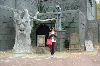 进大门首先看到一个大南瓜,穿过南瓜的嘴巴,是一条挺短的小径,左右两边是卖纪念品和小吃的商店,随后就看到了游乐设施。我是一个喜欢安静的女孩子,不喜欢我不能控制的强烈外力,拒绝玩“暴力”游戏。