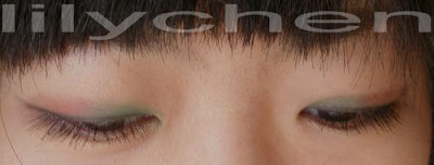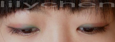 这个眼影让我想起爱丽丝仙境里面戴手表的兔子,扑克国王,用到了三个颜色:墨绿色,棕红色,棕黄色。方法是竖画法,这种方法最近在西方比较流行,也是到目前为止我经常用到的哦。我个人不喜欢日妆,认为很假,给我印象最深的就是浓浓的黑色大圆眼睛,很纯很天真,韩妆颜色较淡,多为分层化法,可以起到让眼睛变大变深邃的作用,而我希望改善的是自己的眼部轮廓,这点正是竖化法的眼影特点。
