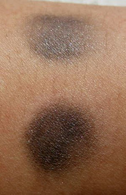 这是130色眼影黑色的眼影粉,属于深色。上面为直接涂抹效果,即便我用刷子反复上色,颜色根本就不附着在皮肤上,颜色不均匀,不饱和;下面是用Benefit打过底的,颜色一下子就比上面的颜色深很多,且有名牌眼影的妆效。很喜欢用Benefit底霜打过底后的眼影光泽。