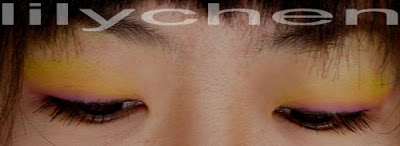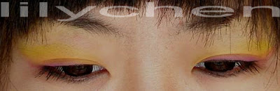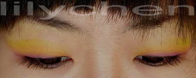 4在橘红色眼影的上方,画J14明黄色,眼尾向上挑。