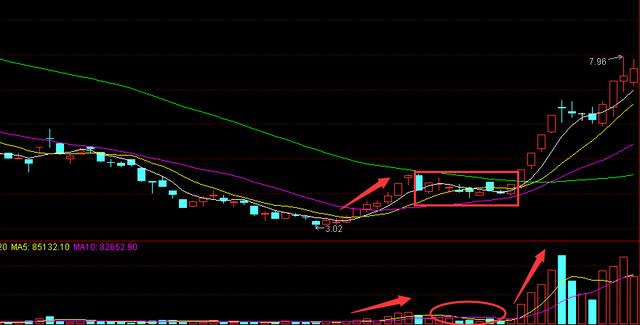 在随后的几个交易日,你会看到有资金参与进来了,K线连续9天收阳,股价缓慢抬升。成交量更为明显,跟椭圆形的量能对比一下,发现量能已经放出数倍了,甚至比前一段时间的量都大,明显显现出来止跌企稳的信号。