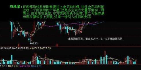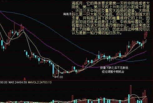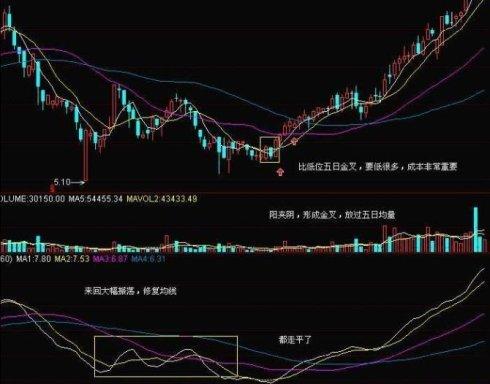 1、平台底:股价在5日均线附近连续平盘三天,迫使5日线和10日均线形成金叉或者5日线上翘、10日均线下移速率变慢,具体的要求是三天中第一天收小阴线,第二天收小阳或小阴,第三天收小阳,整体看三根K线是平移的。