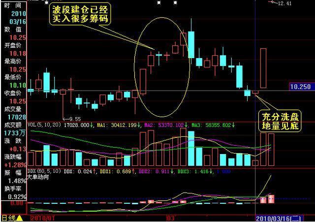 案例:康强电子,从DDE指标来看,2010年2月24日至2010年3月3日是放量建仓的波 段,DDX\DDY红柱都非常明显,成交量也很大。之后连续缩量洗盘,至2010年3月16日时成交量已经缩小到了极限,说明已经没有短线筹码愿意卖出, 短线筹码清理非常充分。而10元的价格位置是主力资金2010年2月24日开始建仓时的最低成本。显然已经到了极限低点。