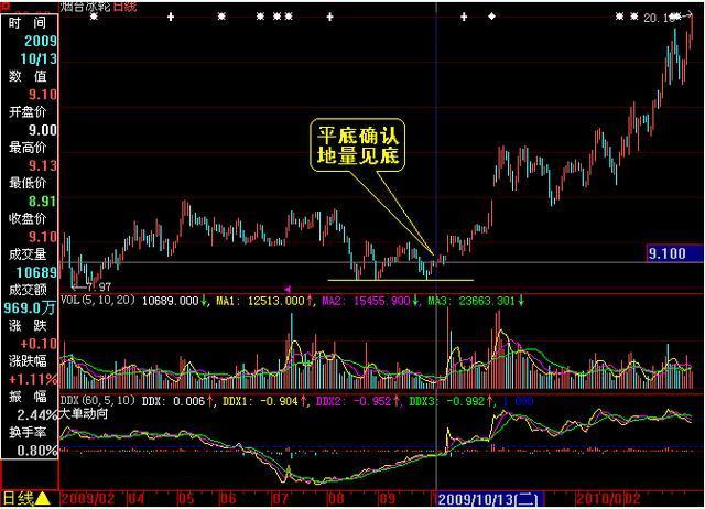 案例:烟台冰轮在2009年8月至9月的调整中,连续三次在8.5元附近获得支撑,形成中线震荡的箱体。说明向下直接杀跌的动能已经不足。成交量的地量水平说明极少的买盘成交量就封闭了下跌空间。后市在买方资金进场的推动下,股价连续强势。则阶段地量见底出现后就形成了中线强势波段。