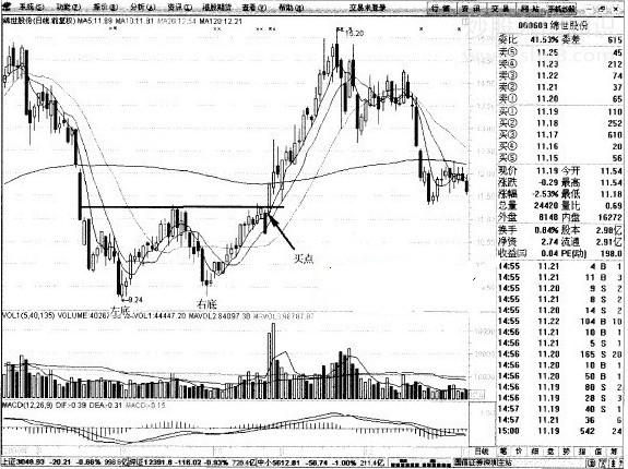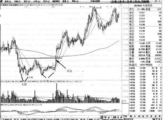 在 上图中,天奇股份(002009)用2.5个月构成了一个小双底,当该股主量向上打破前期高点9.25元时也一举打破120日均线的限制,当日涨停前排队 买进。尽管该股其时相对强度弱于同期大盘和中小板指,可是已经有走强痕迹,当该股进入上升期间打开榜首次回调时,相对强度就强于同期的大盘和中小板指,其 榜首次回调也是第二个好买点。