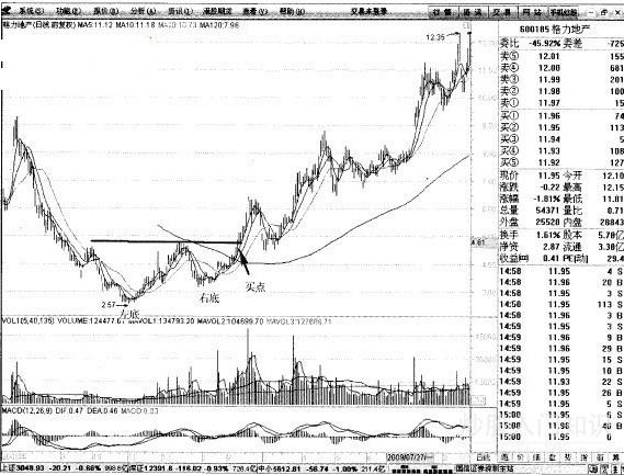在 上图中,咱们看到格力地产(600185),在第四期间创下2.57元的低点之后,开端向上反弹,榜首个底部(左底)构成。当反弹至4.75元后,遭到前 期高点的限制下行,在3.17元的价位处止跌,构成第二底部,随即打开反弹,当股价行至4.75元的价位时,放量向上打破。主升浪即上升期间的上涨就开端 了。
